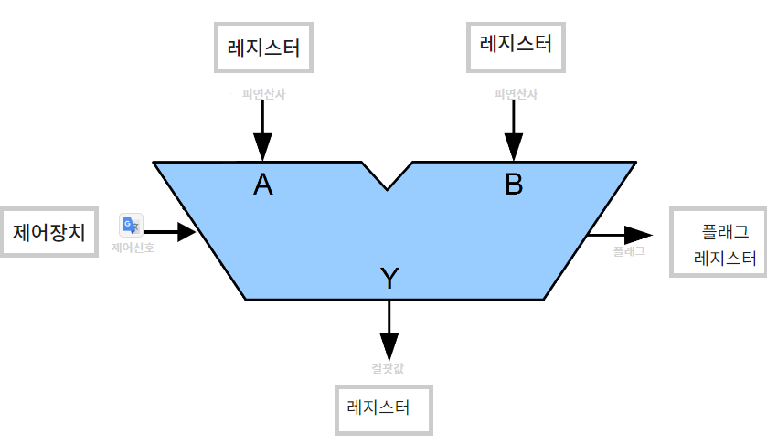 ALU(Arithmetic and Logical Unit, 산술논리장치)는 레지스터를 통해 피연산자를 받아들이고 제어장치로부터 수행할 연산을 알려주는 제어신호를 받아들인다. 이후 레지스터와, 제어장치로부터 받아들인 피연산자와 제어신호를 통해 산술연산, 논리연산 등 다양한 연산을 수행해낸다.