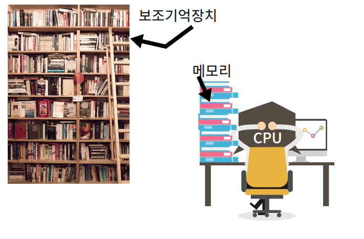 책장이 보조기억장치, 책을 둘 공간이 있는 책상을 메모리 그리고 사람을 CPU라고 생각해보자.