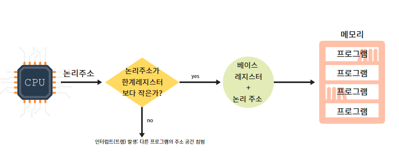 - 논리주소: CPU와 실행중인 각각의 프로그램에 부여된 프로그램이 사용하는 주소
