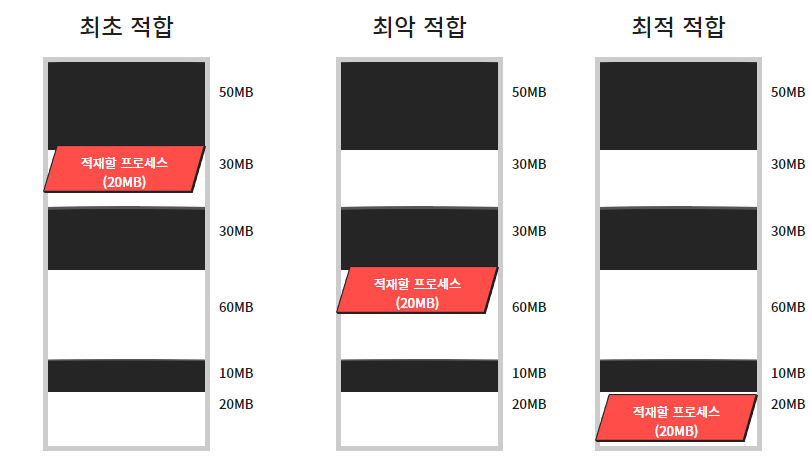 최적 적합: 프로세스가 적제될 수 있는 가장 작은 공간에 프로세스를 배치하는 방식