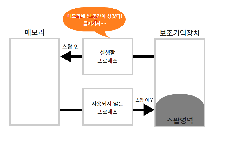 스왑 인: 스왑 영역에 있던 프로세스가 다시 메모리로 옮겨오는 것